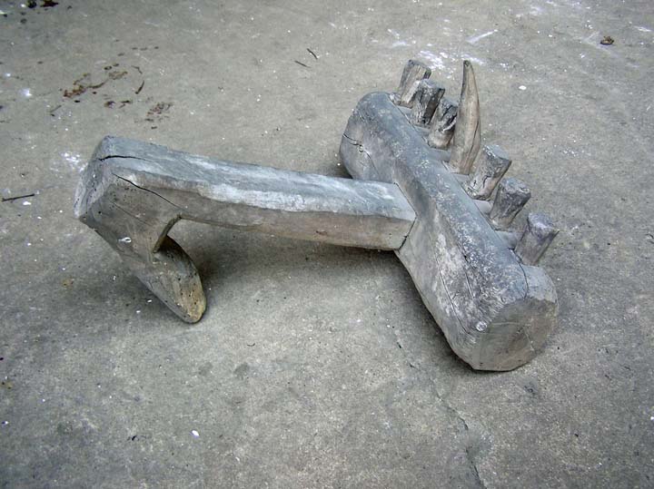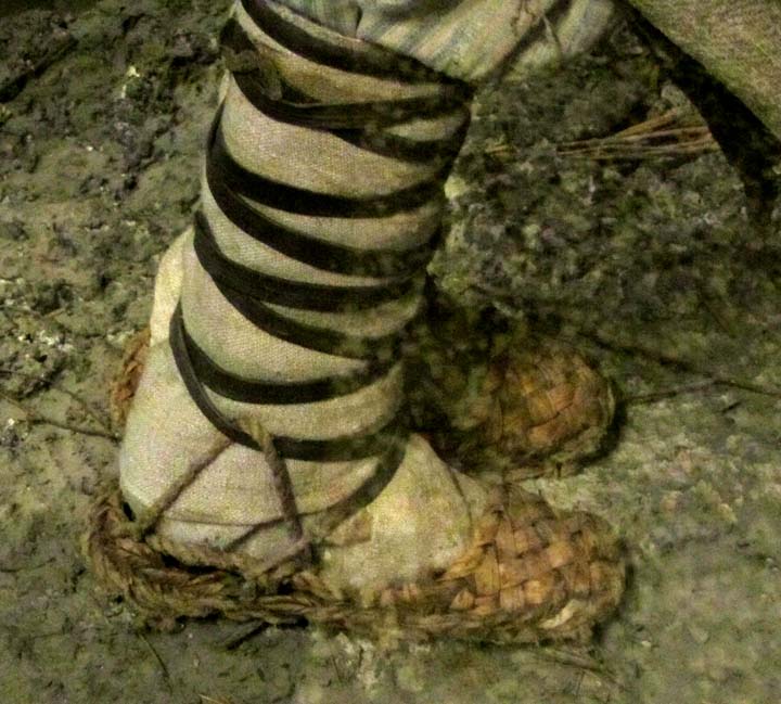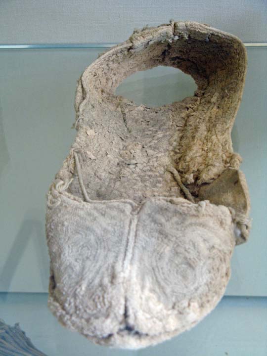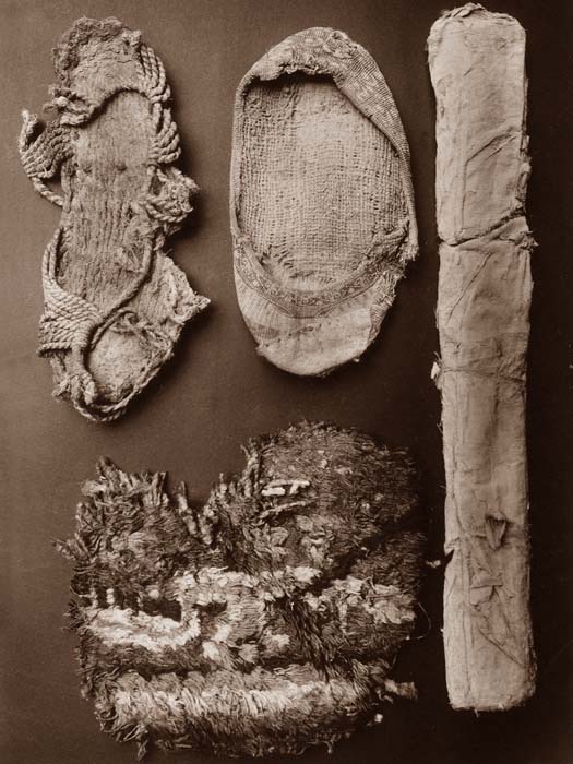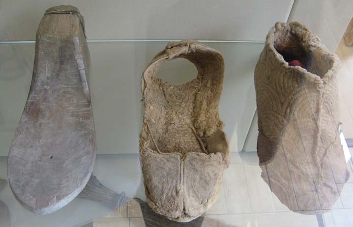 Most of the ancient shoes in the gallery below were excavated by Marc Aurel Stein during his expeditions for the British Museum in the early 1900s. Most of these finds are documented in his two volume book The Ruins of Desert Cathay. Many of these artifacts were found during Stein’s Second Central Asia Expedition (1906-1908) in the ruins of watch towers in and near Dunhuang built and maintained by the Chinese armies. Included in the link above are a hemp shoe and a wooden shoe last, possibly the one shown in the gallery.